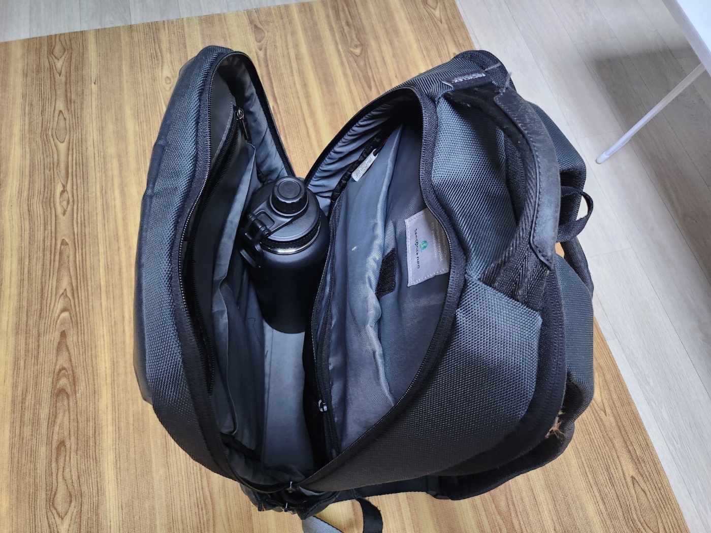 실제로 제가 평소에 들고 다니는 백팩에 넣어봤어요. 크기가 커 보이긴 해도 슬림하게 빠져 있어서 노트북 수납칸 옆에 쏙 들어갑니다. 무게중심이 아래쪽에 있어서 흔들림도 적고, 이동 시 안정감 있었어요.