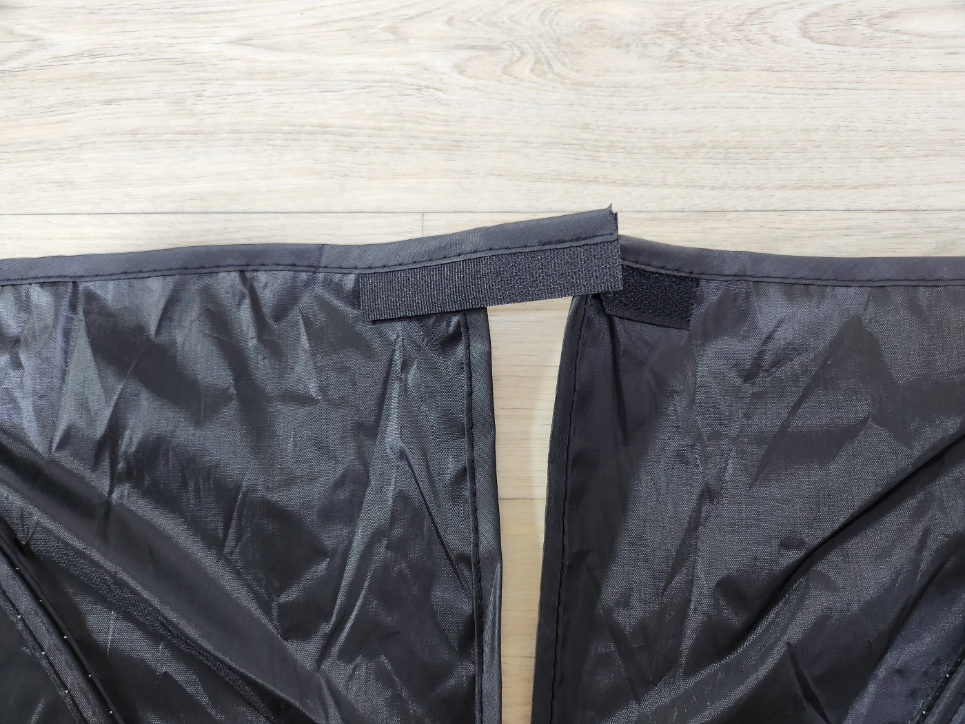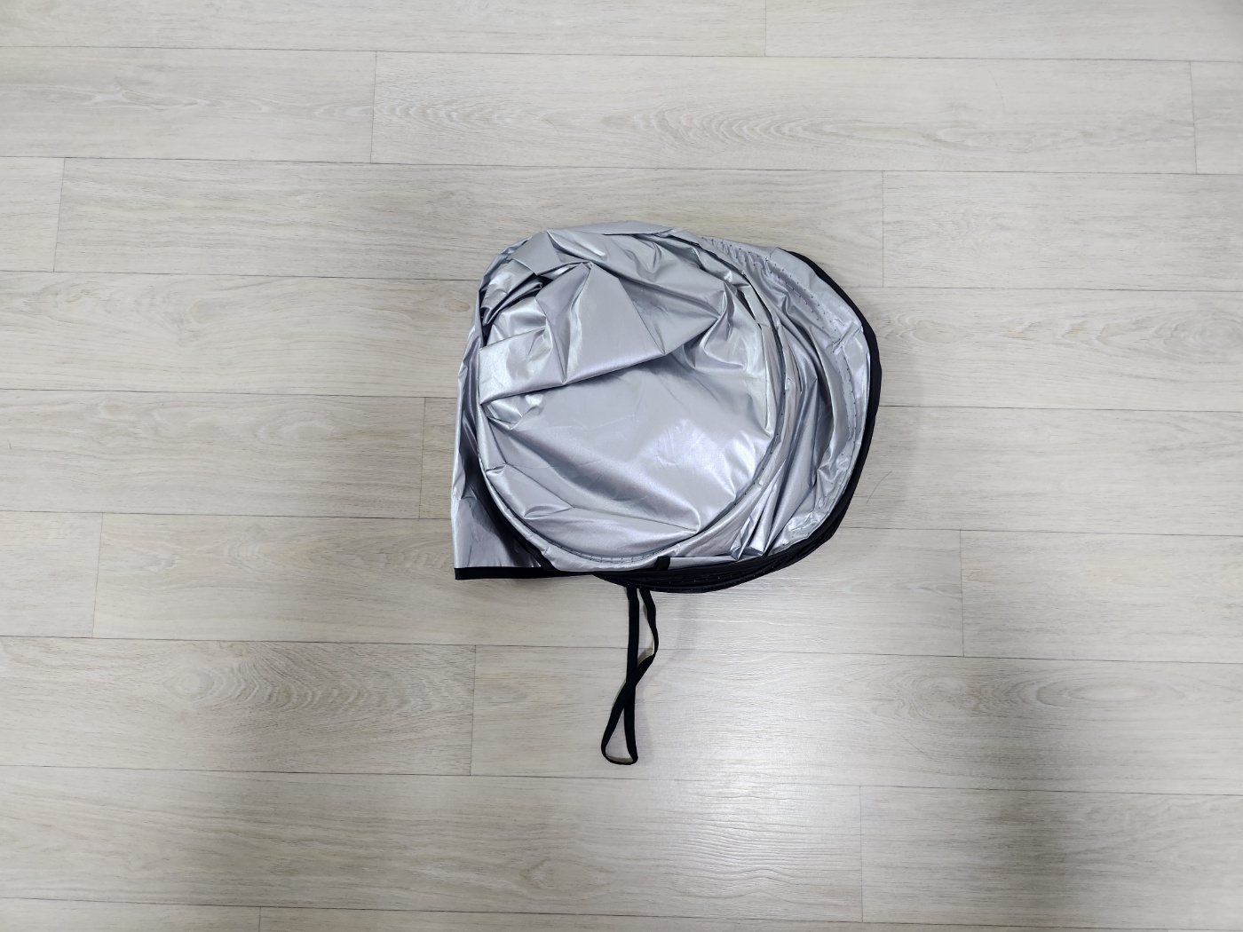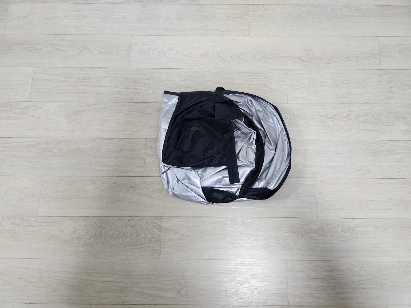 안쪽엔 벨크로(찍찍이)로 고정할 수 있는 스트랩이 있고, 반사면(바깥)과 검정면(안쪽)이 양쪽으로 나뉘어 있습니다.