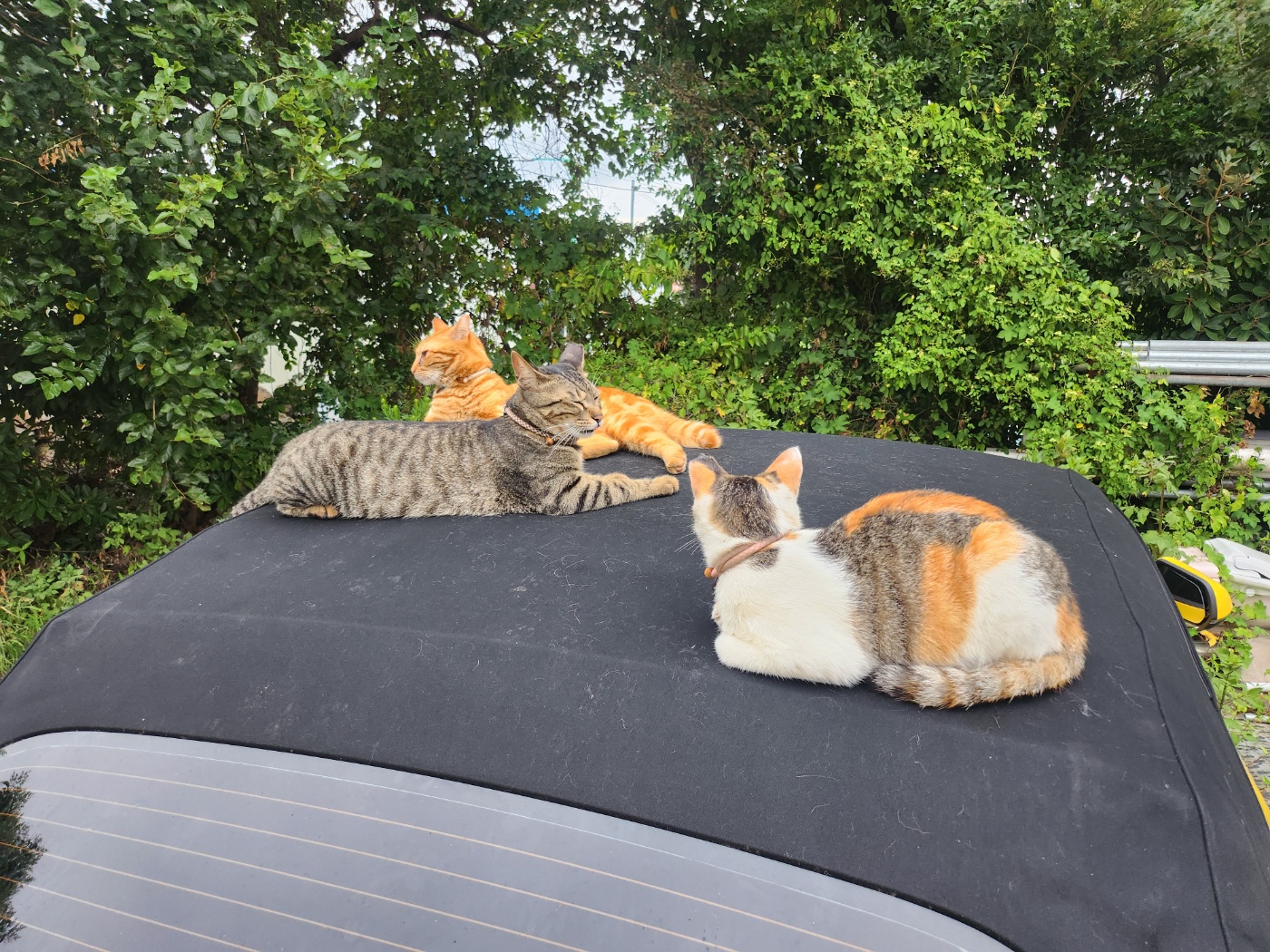 들어오는 입구에서부터 주차장 쪽 노란 머스탱 컨버터블 지붕 위에서 쉬고 있던 체다·초코·방울이의 모습은 정말 귀여웠습니다. 마치 익숙한 듯 ‘여기가 우리 자리야’라고 말하는 듯한 편안한 표정에 절로 미소가 지어졌습니다~ 😄 그리고 애들이 사람을 전혀 경계하지 않았고, 만져도 가만히 있더라고요 ㅎㅎㅎ